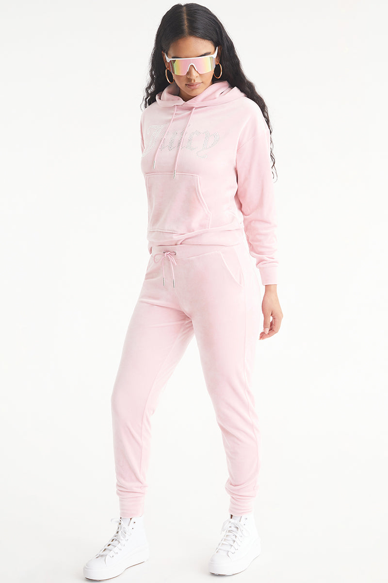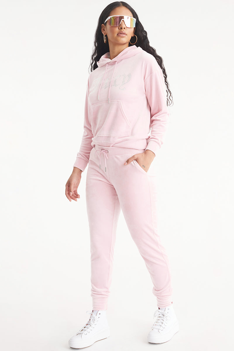 In a longer length made for cocooning, our luxe velour bling logo front hoodie features a kangaroo pocket, relaxed drop shoulders, and JC-stamped drawstring hardware at the hood. This is a laid-back style you need in your life.